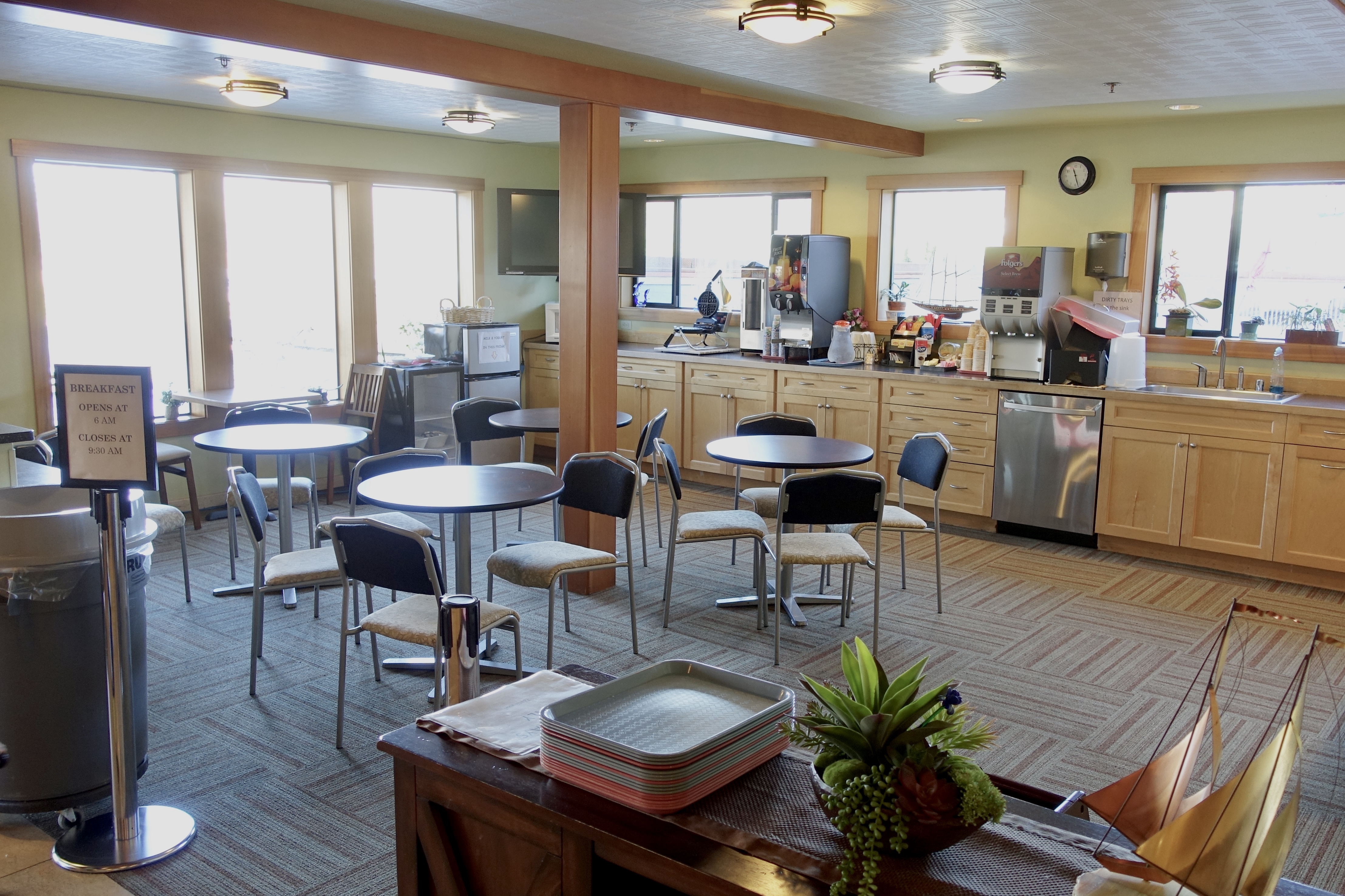 Amenities include a free breakfast (6-9:30 am), free on-site parking and high-speed internet access. There is an elevator, 24-hour front desk service and self-serve laundry. The Harborside offers a meeting room that is available for rent. There is no AC in the Inn, but fans are provided. Check in is at 4 pm and check out is at 11 am. The Inn is a non smoking motel.